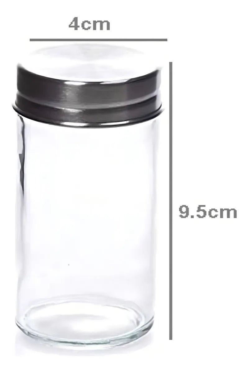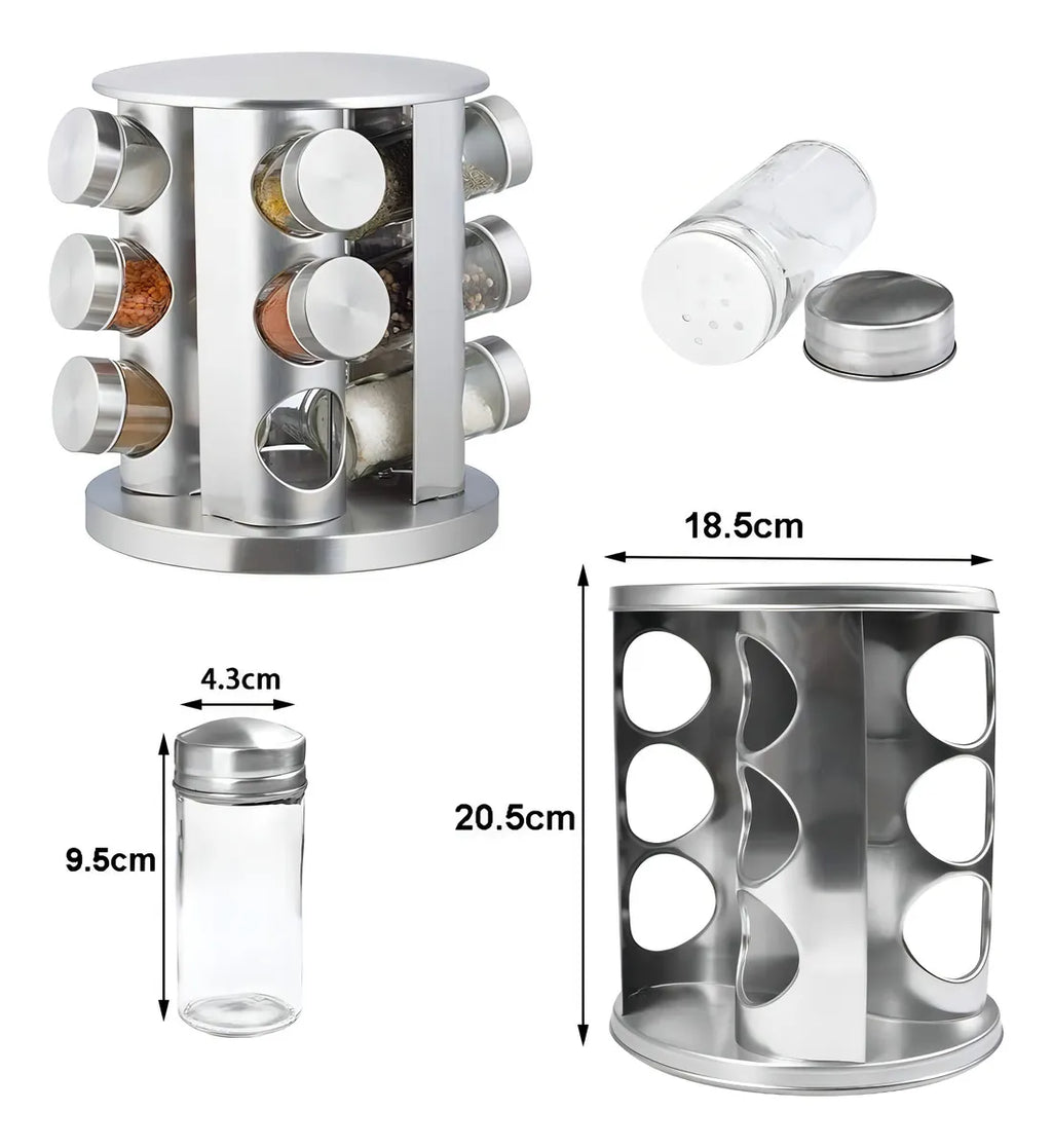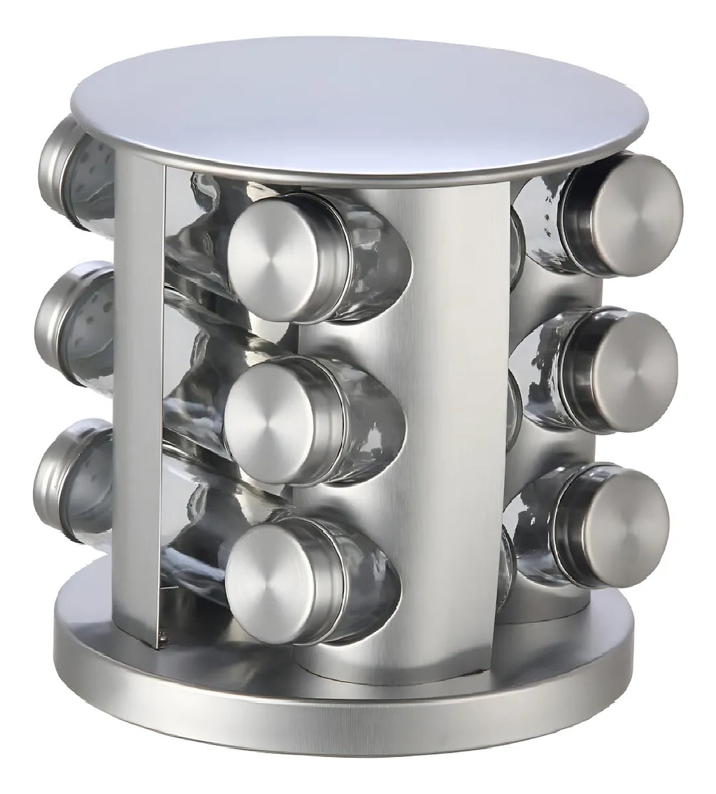 Somos importadores directos Contiene 12 especieros de Vidrio con tapa de acero inoxidable . Soporte de Acero Inoxidable Gira sobre su base 360 grados Presentación: caja color con foto Capacidad Frascos: 110 ml